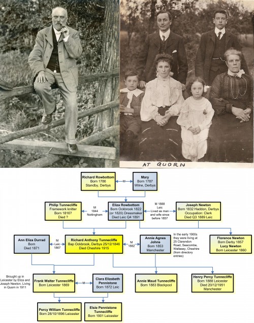 Richard Anthony Tunnecliffe (or Tunnicliffe/Tunnicliff) was born in Ockbrook in Derbyshire in 1846, and was baptised on 25th December that same year in Ockbrook Parish Church. The baptism record states that he was the son of framework knitter Philip Tunnecliffe and his wife Eliza. Philip Tunnecliffe and Eliza Rowbottom had married in Nottingham in April 1844.