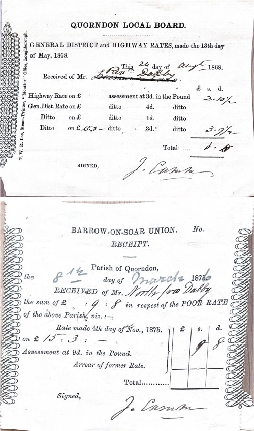 The first receipt is for rates and was issued by Quorndon Local Board which was created in 1864. The money was received from Rev Dalby, although a different name was entered first and has been struck through. It is not known exactly who the Rev Dalby is; there were Dalbys in Quorn at this time, but they were joiners.