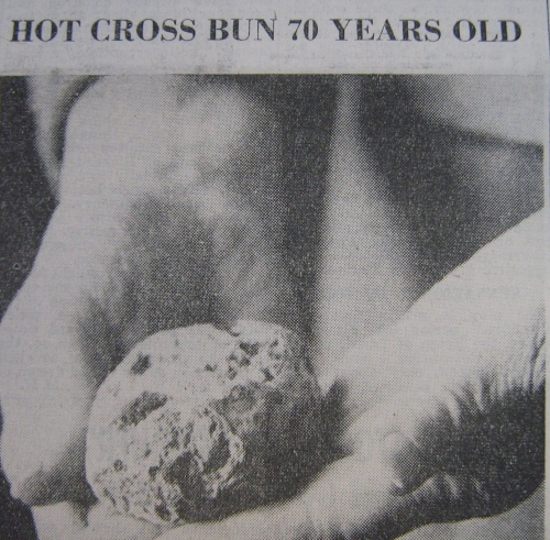 When Mrs Elsie Pittam, of 22 Barrow-road, Quorn, was only three weeks old she was given a hot cross bun by the late Mr T Webster, a Quorn baker. Mrs Pittam is now 70 years of age and she still has the bun! It is rather hard nowadays but otherwise still in its original form without a trace of mould.