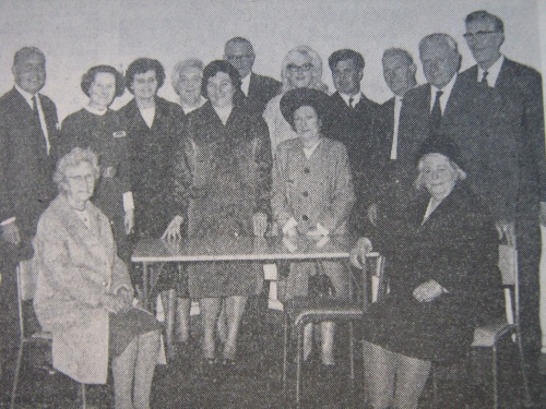 The picture includes: Mrs R Allen, Mrs L Bonshor, Mrs L Commons, Mr E Taylor, Mr Bremner, Matron, Mr F Prevost (group treasurer), Assistant Matron, Mrs A Bollard, Miss D Harris, Mr Kemp, Mrs M Bradshaw, Mr B Bradshaw, Mr J Boyer, Mr H Lacy (group chairman), and Mr Pitts (hospital secretary)
