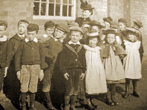 The schoolmistress in this photograph is Miss Isabella Corlett. She arrived at the school in 1865 to teach the Infant department of the National School working single-handed until the number rose from 40 to 90 pupils. She had the reputation of being a disciplinarian and expected good behaviour both in and out of school. She retired to the Isle of Man in 1906 and died in 1935 at the age of 95.
