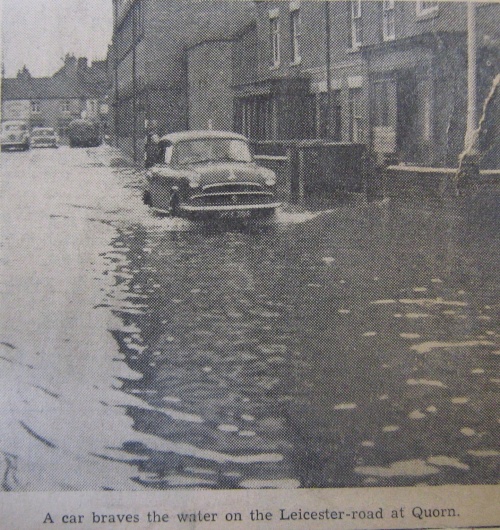 At Quorn on Saturday night a double-decker bus was involved in a collision with a car which had run into flood waters. Passengers in another bus had the unusual experience of seeing water come through the floorboards beneath their feet.