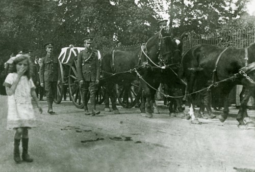 Captain Harold Wright’s military funeral procession on High Street, Quorn, passing The Banks on Friday 17th September 1915, on the way to Quorn St Bartholomew’s Church.
