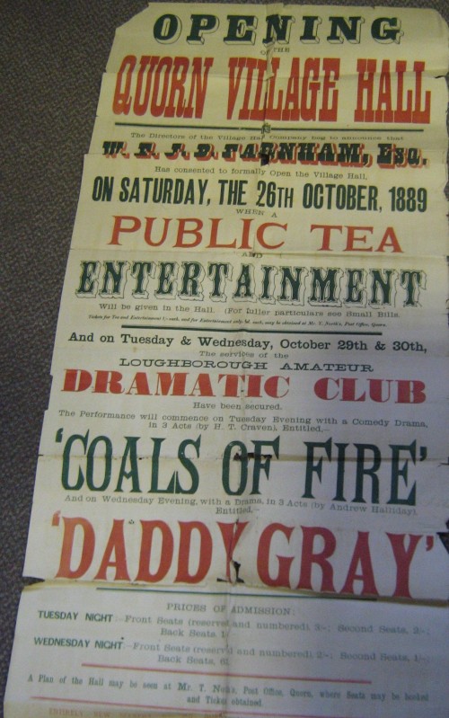 Poster advertising the opening of the village hall in 1889. This poster is housed in Leicesterhire Records Office