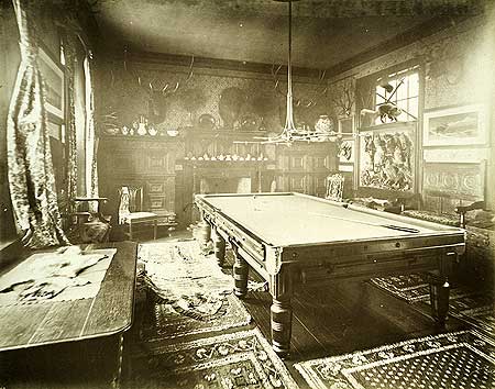 Interior of the billiard room at Quorn Place. The Bedford Lemere daybook lists the architect as W Bliss Sanders. The image was taken for Charles Martin, owner of Quorn Place. The photograph was taken on 8th February 1886 by renowned photographer of the time, H Bedford Lemere.