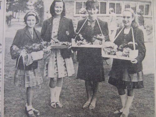 "We were trying to persuade the fete goers to purchase small posies of flowers from us! We provided the flowers and made up the bunches ourselves,I raided my parents large garden for my flowers. We were all keen first year pupils! I have many happy memories of Rawlins Grammar School."