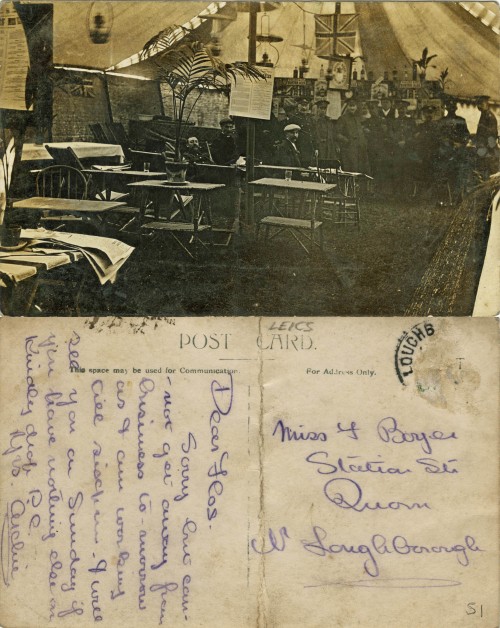 This postcard was sent by 'Archie' in Loughborough in 1914 at the beginning of WW1, to Flos (Florence) Boyer on Station Road in Quorn. The picture is of the sergeant’s mess. A detailed examination of the card revealed that the poster attached to the pole in the centre is headed ‘Sergeant’s Mess Rules’.