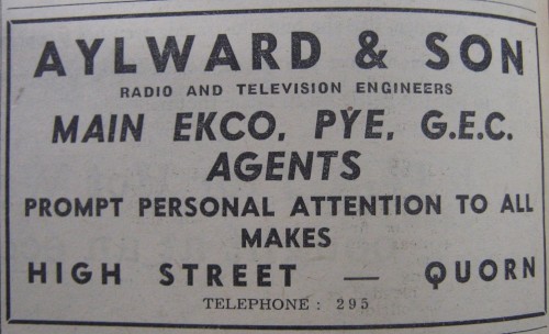 "Aylwards was an electrical shop next door to the White Hart on High Street. Next door to that was Dr Wykes's surgery, where one just went inside, sat down & waited one's turn. The Aylward family lived at no 3 Castledine Avenue, Quorn"