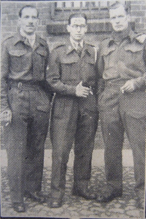 Pte. P J Haywood (centre), whose wife and child live at Station Road, Quorn, has sent the above picture from Stalag XXA (35). He was taken prisoner in May, 1940. He was educated at the Loughborough College and later worked at Messrs H Morris Ltd. Prior to the war he was in the 2/5 Leicestershire Regiment Band and a drummer in the Embassy Dance Band.