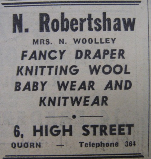 This was the business of Norah Robertshaw which was simply known locally as "Robertshaws". The business was originally owned by Mrs Hefford at 4 High Street. She retired and it was taken over by Norah in 1936 at 6 High Street, this being a newly converted shop premises, (now the 'Tandori Empire').