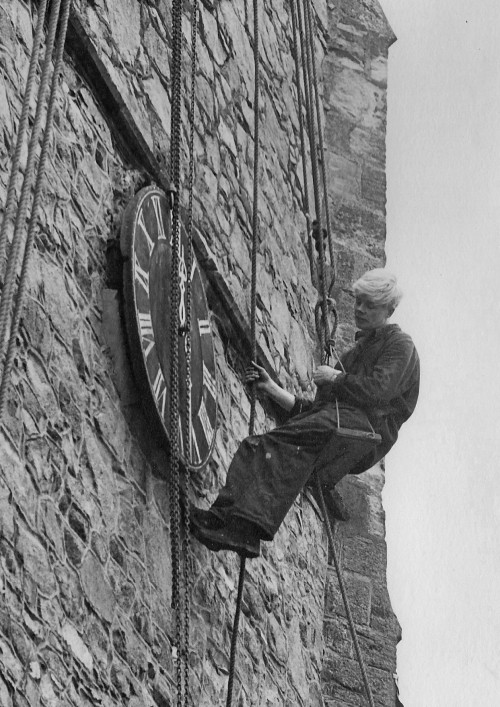 This photograph was taken on Monday 23rd November 1964, when a firm from Derby were removing the old slate clock face on St Bartholomew’s Church. It had ‘slipped’ by three inches and was found to be extremely unsafe. The two-inch thick slab of slate, which is four and a half feet in diameter and weighs over four hundred weights (32 stones or 200 kg), is flat on the ground in the Churchyard by the large beech tree, as you walk from Church Lane towards the Church.