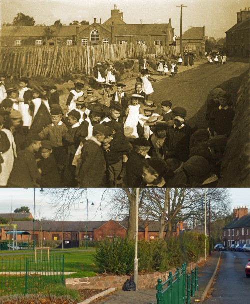 This view is looking up towards the old primary school with Stafford Orchard on the left. The older photograph was taken in the early 1900s. The modern photograph was taken in 2011 shortly after Stafford Orchard was refurbished. It is sad to see the old primary school boarded up.