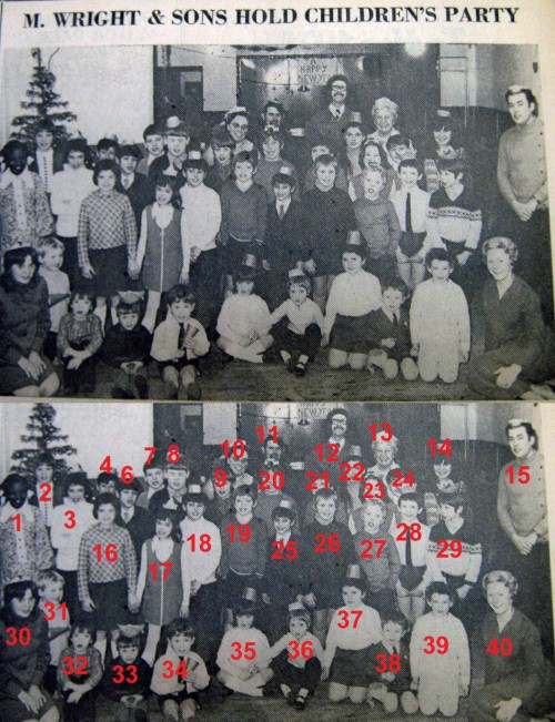About 40 children had a grand time in the works canteen of Messrs M Wright & Sons Ltd., of Quorn Mills, Quorn, on the occasion of their New Year party. This was organised by Mrs M Lane, assisted by Miss L Bettany, Mrs D Bignall, Mrs D Lidierth, Mrs O Brewin, Mr T Buckingham, Mr J Hicks and Mr D Williams and the afternoon was spent playing games and having tea. The presents were presented by Mr Michael Wright, a director of the firm. The canteen was decorated by Mr K Ward, Mr O Hall, Mr T Jollands and Mr P Long.