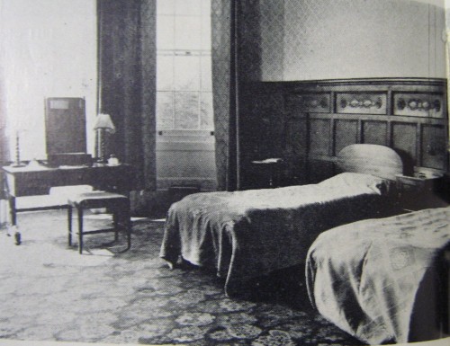 Appropriately named because of the half panelled walls and carved oak over-mantle to the fireplace. This is a bright cheerful room with three long windows overlooking the lawns through which the sunlight pours onto the gleaming white paint. The decorations are in a delicately patterned pale blue, with a daffodil yellow ceiling reflecting the sun. The bedspreads and carpet are in a matching shade of blue.