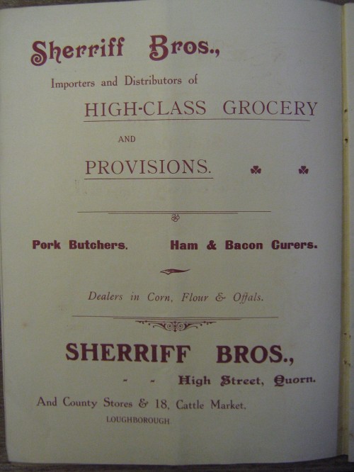 An advertisement for Sherriff Brothers, grocers and butchers from a village hall souvenir booklet of 1906