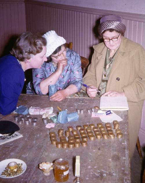 This photograph captures (left to right), Phyllis Field, Lily Callaghan and Amy Child counting the money after a Church event in the 1960s.