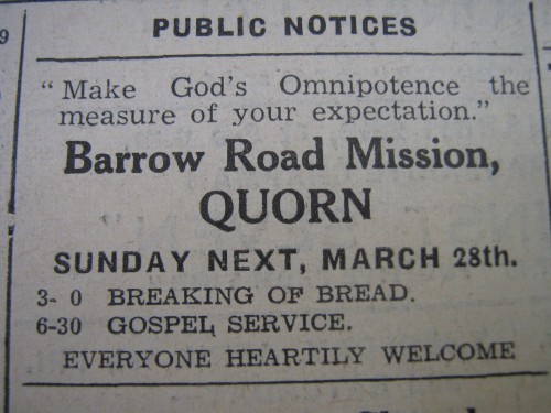 Originally run by the Teagle family in the early 1900s as a Gospel Temperance Mission, it was resurrected by Miss Hallam of Loughborough in 1945 (see artefact 1304 and artefact 1386)
