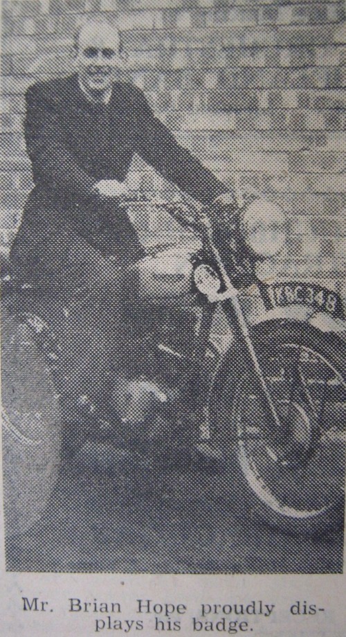 Mr H.B. Hope, of 5, Castledine Avenue, Quorn, is one of the first motor-cyclists to be awarded the road safety badge of the Auto Cycle Union under a scheme inaugurated this year. He is 27 years of age and is employed as a photographer by a Leicester firm.