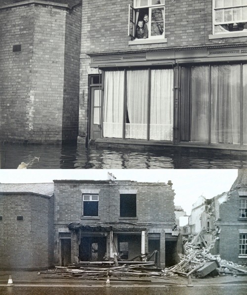 The top photograph was taken during floods in the 1960s and appeared in the Leicester Mercury. It shows Harry and Ada Yeomans avoiding getting their feet wet at their home on Leicester Road. The shop was just opposite the entrance to Hall Leys (about where Weavers Close is), and the lower picture shows it being demolished in 1977.