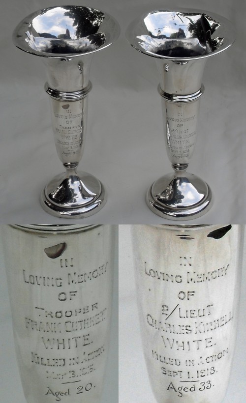 Frank White was killed on the 13th May 1915, at the battle of Frezenburg, a stage in the Second Battle of Ypres in Belgium, see Artefact 2276. Charles, died in action in action in France on 1st September 1918. For more details see Artefact 2275.