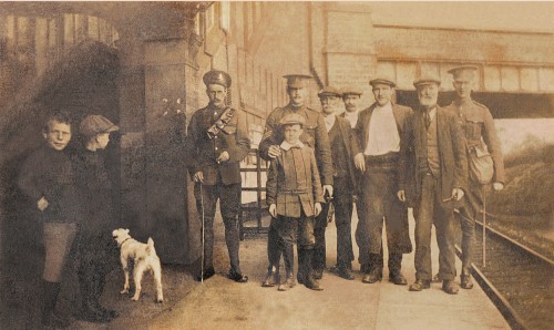 Walter Giles was born in Quorn in 1888. During WW1 he was a signaller and fought in the Gallipoli campaign. This exceptional photograph shows Walter on Quorn Station, leaving home to go to war. Walter is standing in uniform, on the left, by the pillar, with a bandolier of ammunition across his chest. The man third from the right, looks as if he may have been a blacksmith, as he seems to be wearing leather apron, which is open in the the middle, which would allow him to hold a horse's leg.