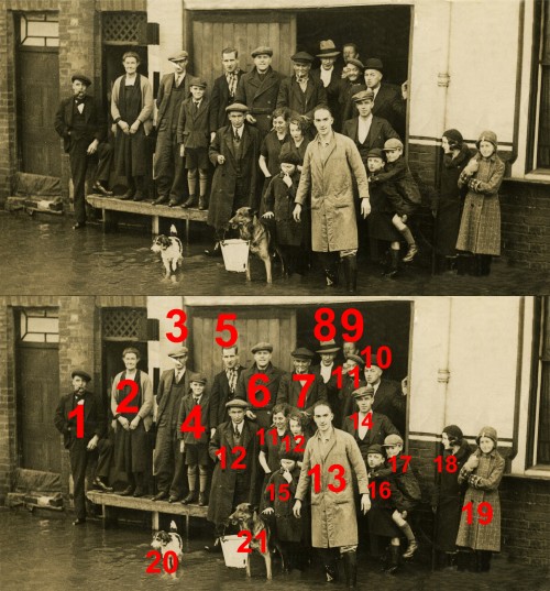 This photograph was taken in the floods at Quorn Cross/Meeting Street, by the Royal Oak in either 1932 or 1933. It is a lovely picture, showing friends and neighbours - and note the dog holding an enamel bucket!