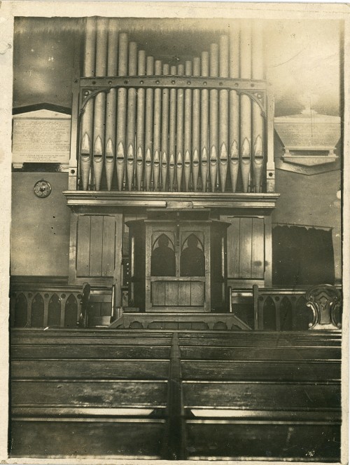 A rare view inside the Baptist Chapel, showing the old organ pipes very clearly. The photograph is thought to date from the early 1900s.