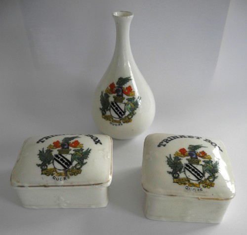 This type of small crested china pottery was very popular for holiday souvenirs, in the late Victorian times, up to about the 1930s. The two little Arcadian trinket boxes are different sizes and are particularly unusual. For more information about Quorn Souvenir China see Artefact 1794