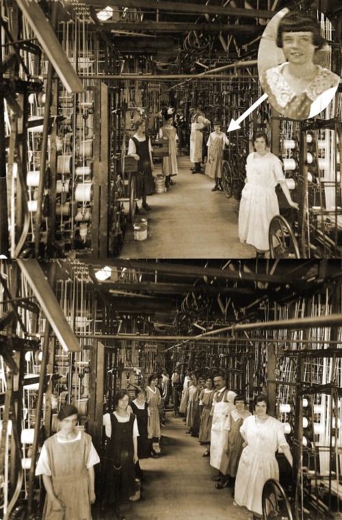 One of the elastic weaving rooms at Wright's factory, Quorn in 1923 or 1924. The young girl, second from the right, is fourteen year old Nellie Marchant who lived on Barrow Road.