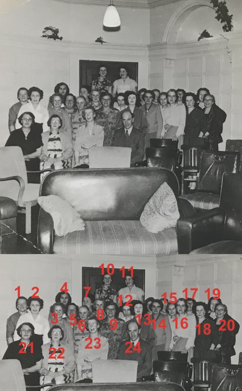 Elsie Bishop was born (as Elsie Lovett) in Quorn in 1912. She married her husband Roy in 1933 and they lived at 27 Nursery Lane. Elsie was a cleaner and waitress at Quorn Hall and this photograph was taken from her album. The occasion is thought to be a party to celebrate the wedding of Frank Ockenden and Kathleen Burns in 1958. Frank and Kathleen both worked at Quorn Hall. Elsie is on the right (number 20).