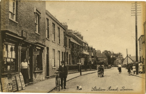 In the mid-distance is the Pig and Whistle pub with the gantry which was used to hang the pub sign. The gantry still remains today. The pub was originally a general store and newsagent. It became a public house in the 1890s and is now a private residence. The shop on the left was Gamble's the newsagent, whose name appears on the back of the postcard as the publisher.