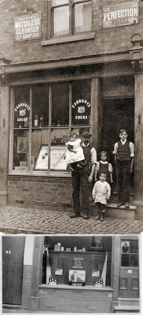 The first of these photographs was taken in about 1909 and shows Joseph Birkin standing outside 12 Freehold Street, which was a shop and off-licence. Although Joseph worked as a fitter (in a hosiery factory), the family pulled together and ran the shop.