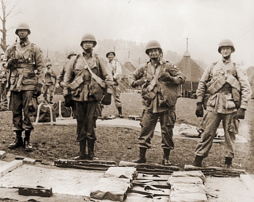 Members of the US 82nd Airborne Division, 505th Parachute Infantry Regiment, 2nd Platoon Mortar Squad Company F, prior to D-Day at Quorn Camp 1944.