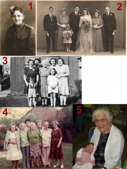 Picture 3 – Easter 1947. Adults left to right: Irene (Rene), Winnie (Win), Martha (their mother),Olive, Iris. Children are Terence (Olive’s son) and Valerie (Win’s daughter).