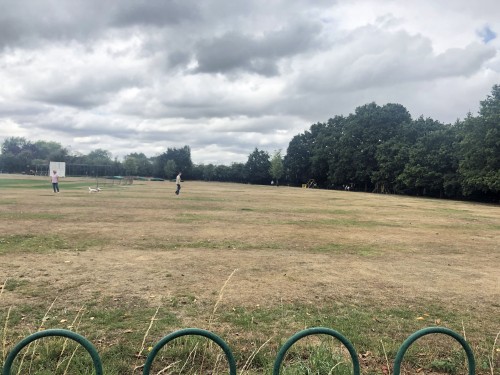 This photograph of Caves Field (the cricket field), taken during the heatwave of August 2022, shows the remains of old ‘ridge and furrow’, with green grass in the furrows.