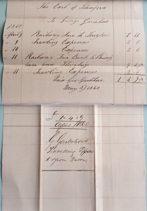 This document relates to the payment of expenses to George Gartshore by his employer, George Harry Booth-Grey, the 7th Earl of Stamford in April 1860. Lord Stamford was Master of the Quorn Hunt from 1856 to 1862.