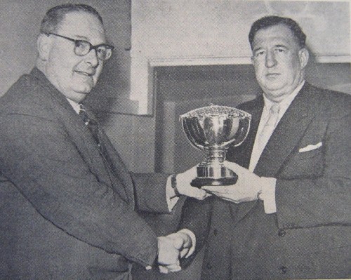 The bowl will be presented annually to the league player registering the most "tons" in a season. It was received on behalf of the League by its chairman, Mr S Waterfield. Another highlight of the evening was the special challenge match held between a League representative team and a team of "Leicester Aces" invited by ever-popular Len Gray.