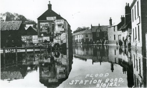 Station Road flooded in August 1922. Note the railings of Black Green on the left. The Black Green is now the car park.