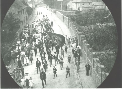 An early custom of the Oddfellows Society in Quorn was that of 'walking the village in procession' on August Bank Holiday, as shown c1906. Having lapsed for several years, this annual event was revived in 1895, when a service was held in the parish church on the previous Sunday for the Oddfellows and the Mutual Aid and Hand and Heart Benefit Societies. The custom of 'walking' the village finally ceased during the first World War. The parades were led by the Mountsorrel Band. After wards the Oddfellows repaired to the Bull's Head for a feast and then sports and a tug-of-war took place.