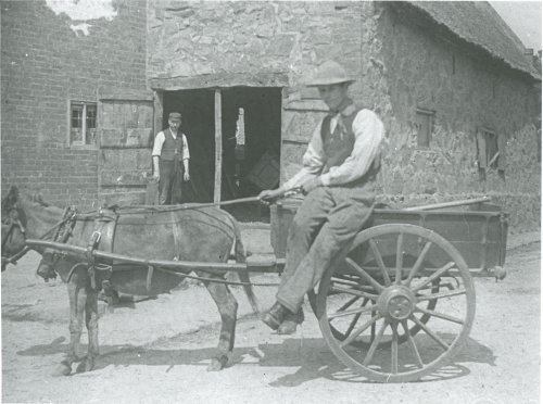 Billy Lovett, the rag and bone man, with his donkey and cart outside Joe Bates' Wheelwright's Shop in School Lane about 1900. Billy was a well-known character who did odd jobs for people around the village.