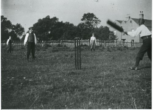 Boys playing cricket on the Stafford Orchard park. In those days the park was frequently grazed by cattle and horses.