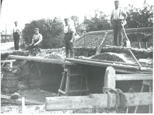 Workmen demolishing the 'Little Bridge' over the stream in School Lane to make way for a new one to commemorate the diamond jubilee of Queen Victoria.