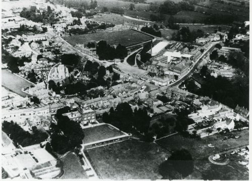 The open area lower-right is now the Sanders Road area. The Stafford Orchard can be seen upper-centre and just below it The Dower House is hidden by trees. Just to the left of the trees, cottages can be seen that once fronted onto Station Road. Most of these have since been demolished.
