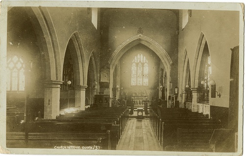 The eagle lectern is in the same place as it is today, but note the absence of the rood screen. Above the chancel arch it says 'GLORY TO GOD IN THE HIGHEST. ON EARTH PEACE GOODWILL TOWARD MEN.'