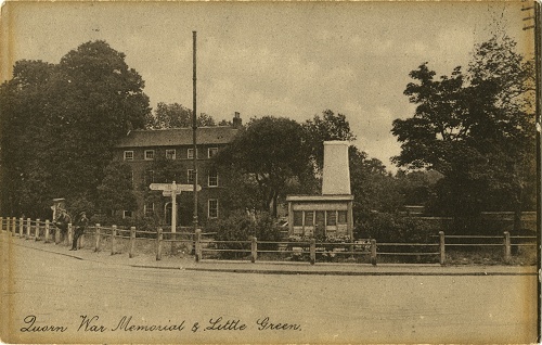 This photograph is taken from the Cross looking towards the Memorial Gardens (then known as the Little Green). It shows the temporary war memorial with the permanent memorial being constructed behind it.