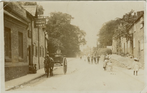 This is looking along High Street to Loughborough Road from the centre of the village. The White Hart is easily recognisable on the left, but the cottages on the right were demolished many years ago. In their place is now the landscaped area also known as 'The Banks'. The cottages were raised from the road and shortly after this photo was taken, railings were put along the footpath which ran by their front doors.