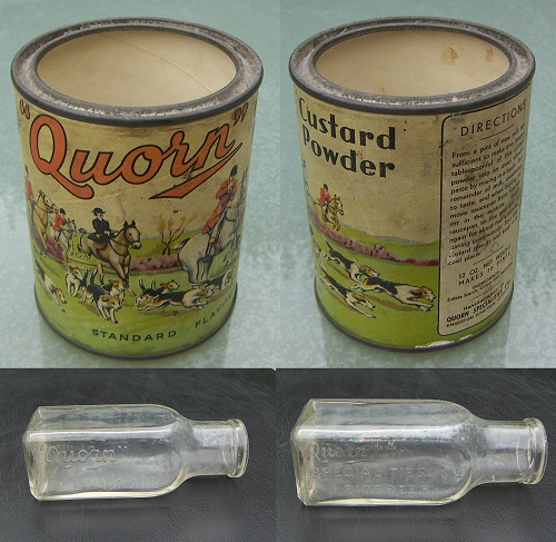 Quorn grocery products - and we don't mean the modern 'textured vegetable protein'! - were a common sight on the shelves of grocery stores in the 1940's all over Great Britain. Quorn Specialities Ltd started in the early 1900s and was based at Knighton Junction, off Welford Road in Leicester. They were named after the Quorn hunt, and their vans and custard tins were colourfully illustrated with hunt scenes.