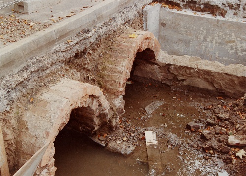 Builders break into the culvert carrying the stream from Tom Long's Meadow into Quorn Brook. This stream runs under Meeting Street a little further down from the entrance into Sanders Road. Taken 18th October 1989.