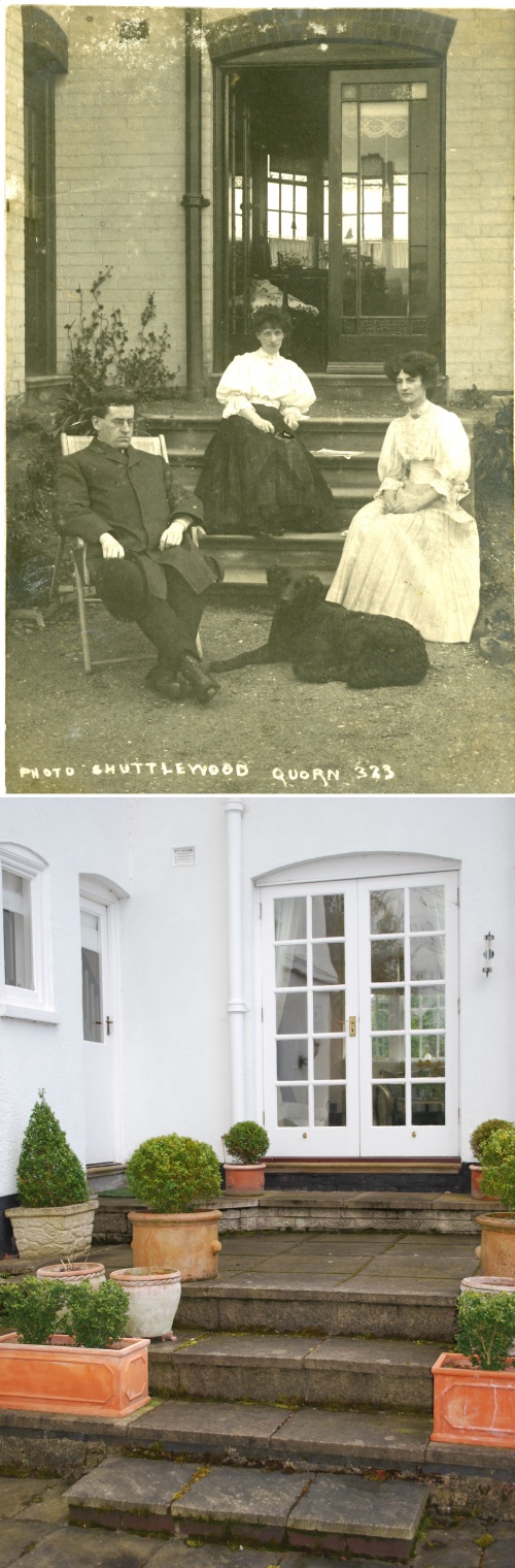 Because the Neal family were the first residents in 1904 and because the house was sold after Edwin Neal's death in 1922, it would seem reasonable to assume that the people in the photograph are the Neal family. The Neal's did not appear to be living in Quorn in 1901, but they are here (from the census), in Woodhouse Lodge in 1911. Edwin and Nellie (his wife) were 41 and 40 years old at that time and had been married for 16 years. They had a one year old son, Geoffrey Paul Palmer Neal and it was noted that a previous child had died. Edwin and Nellie were both born in Leicester, Edwin was an 'Incorporated Accountant' and classed as 'an employer' on the census. They must have been reasonably well off as they had two live-in servants. It would seem almost certain that the gentleman on the left in the postcard is Edwin and that one of the women is Nellie.