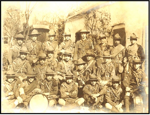 This photograph is probably of the Mountsorrel Scout Troop. The photograph was taken around 1911 in the back garden of Raven Cottage (no 31) Meeting Street (next to the Blacksmith's pub).